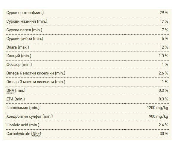 ЕНЕРГИЙНА ЦЕННОСТ И РАЗПРЕДЕЛЕНИЕ: Метаболитната Енергия е 3510 kcal/kg (419 kcal за 250мл/120g чаша) като 29% от енергията е от протеин, 41% от мазнини и 30% от плодове и зеленчуци.