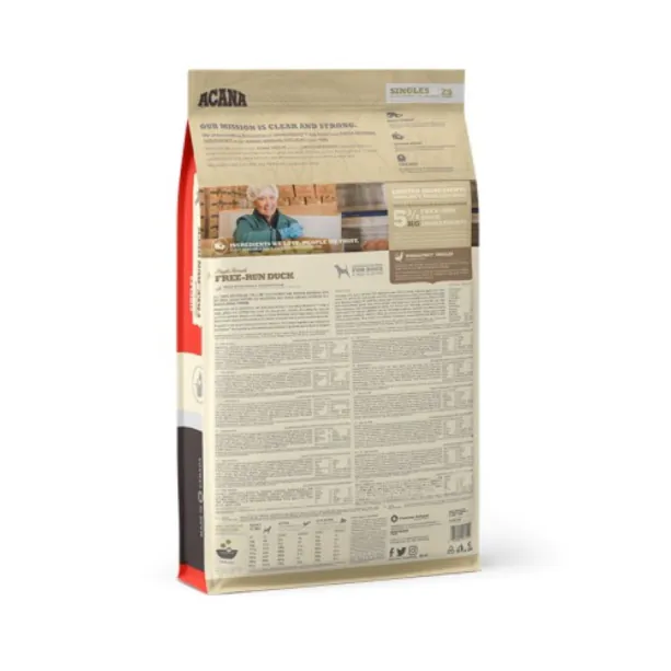 ACANA Free-Run Duck е биологично съответстваща суха храна с ограничен състав, разработена за кучета с чувствително храносмилане и хранителни непоносимости.