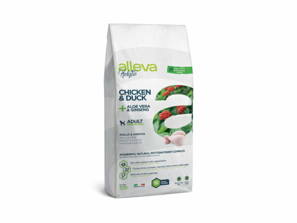 Alleva Holistic Adult Medium е с голямо съдържание на висококачествени протеини (65-75%) от пилешко и патешко месо. Диета подходяща за животни, които се нуждаят от лесносмилаем източник на протеин. Може да се използва и по време да обучения. В Alleva Holistic Adult Medium е добавен още микс против стареене, Алое Вера за подсилване на имунната система и подпомагане на регенерацията на кожата. Естественият корен от женшен също се грижи за силите на организма и централната нервна система. Включен е още таурин, които се грижи за правилната работа на сърцето, зрението и репродуктивните способности; L-карнитин за добрия метаболизъм и куп други вещества, обогатяващи формулата.