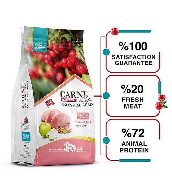 Carni Life Cranberry Adult Light Turkey & Apple е хиперпремиум храна, създадена за кастрирани кучета и такива с наднормено тегло. Сочни ябълки и червени боровинки в комбинация с прясно пуешко месо осигуряват контрол на теглото, здраво сърце и блестяща козина – без компромис с вкуса. Лесносмилаема формула с ниско съдържание на мазнини и пълноценен хранителен профил за здрава и жизнена фигура.