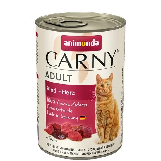 Пълноценна супер премиум консервирана храна за израснали котки с телешко месо и сърца. Animonda Carny Adult осигурява високо съдържание на месо, натурален вкус и балансирано хранене без зърнени култури.