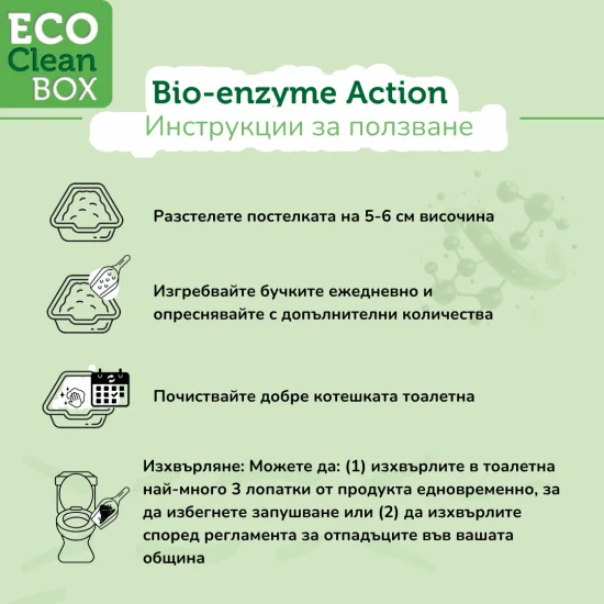 ECO CLEAN BOX Tofu е иновативна натурална котешка тоалетна от тофу с биоензими, създадена от растителни влакна. Осигурява отличен контрол на миризмите, потиска развитието на бактерии и е напълно биоразградима и безопасна за изхвърляне в тоалетната.