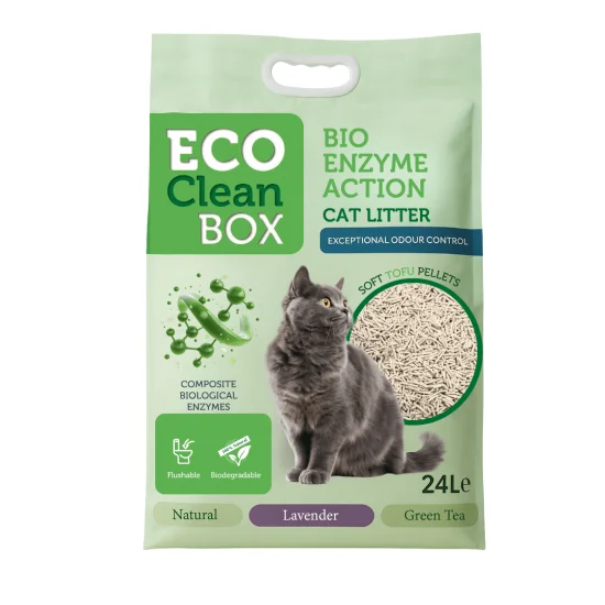 ECO CLEAN BOX Tofu Green Tea е екологична котешка тоалетна от тофу с биоензими и лек, освежаващ аромат на зелен чай. Осигурява отличен контрол на миризмите, потиска бактериите и е напълно биоразградима и подходяща за изхвърляне в тоалетната.