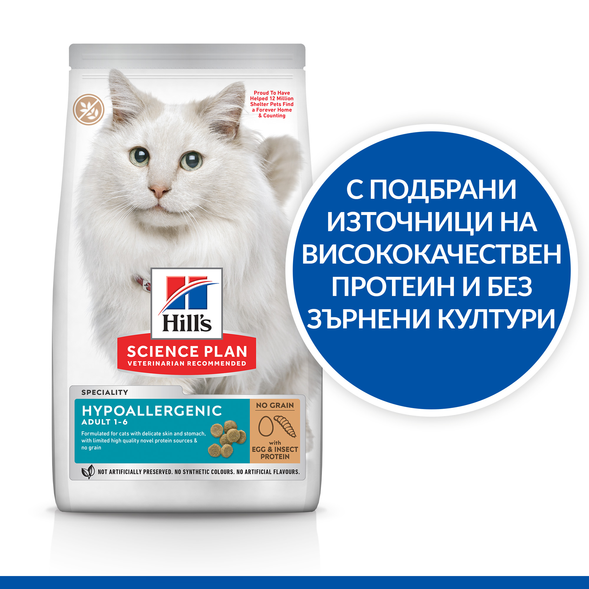 Hill's Science Plan Hypoallergenic Cat с яйчен и насекомен протеин, е пълноценна храна за израснали котки на възраст 1–6 години. Формула с ограничени източници на висококачествен, нов протеин и без зърнени култури.