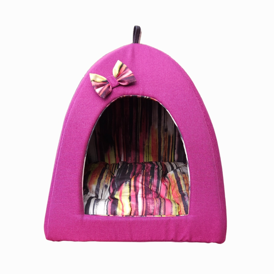 Това иглу легло комбинира ярък лилав цвят с артистичен десен на възглавничката, за да създаде уютен и стилен кът за вашето куче или коте. Изработено в България от висококачествени дамаски и пълнеж от дунапрен, то осигурява отлична мекота, топлина и защита.