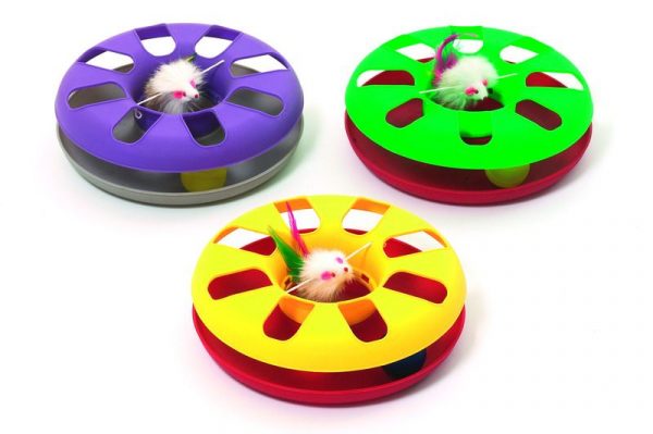 Играчка за коте Karlie - кръгла играчка, по средата на която има мишка, закачена на ластик, а под нея се върти топче. Много интересна за котките.