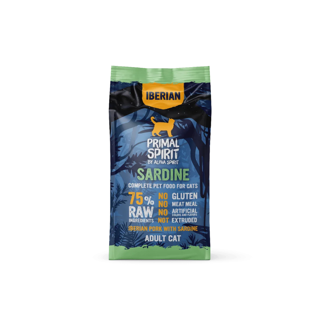 Primal Spirit Cat Iberian Pork & Sardine е висококачествена суха храна, приготвена от свежи съставки без глутен, субпродукти и изкуствени добавки. Студено пресована технология запазва всички хранителни вещества и гарантира отличен вкус. Подходяща за кастрирани и домашни котки.
