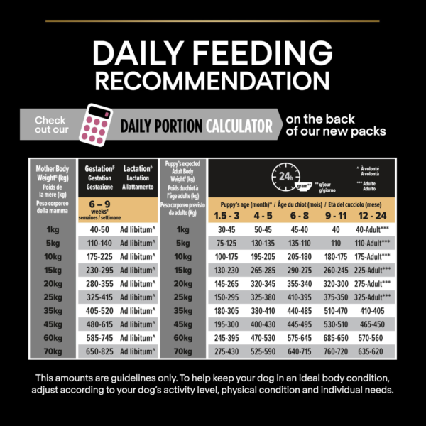 Виж таблицата. Тези количества са препоръчителни, за да се поддържа идеално телесното Състояние на твоето куче. Те се менят в зависимост от възрастта, нивото на активност и околната среда. Наблюдавай теглото на твоето куче и коригирайте дневните дажби съобразно това. Винаги осигурявай чиста и прясна вода за пиене. За здравето на твоето куче се консултирай редовно с ветеринарен лекар.